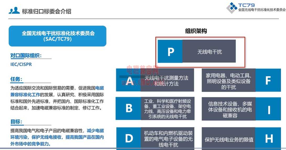 四、组织架构(图示说明)TC79 下设多个分技术委员会(SC),分别对应不同领域。根据图中结构,其组织分为以下几个部分: | 分类 | 内容 | P | 无线电干扰(总体方向) | A | 无线电干扰测量方法和统计方法 | B | 工业、科学和医疗射频设备;重工业设备;架空电力线、高压设备和电力牵引系统的无线电干扰 | D | 机动车和内燃机驱动装置的电气电子设备的无线电干扰 | F | 家用电器、电动工具、照明设备及类似设备的干扰 | I | 信息技术设备、多媒体设备和接收机的电磁兼容 | H | 保护无线电业务的限值 |