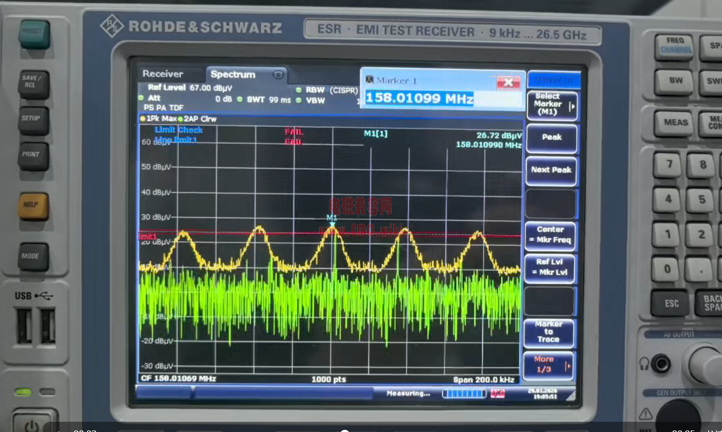 二、 证据对比:同频不同相请看我们使用 Rohde & Schwarz 接收机捕捉到的两组现场波形,它们都在158MHz附近,但“长相”却截然不同。 158MHz CLK 网线 158MHz data 显示屏
