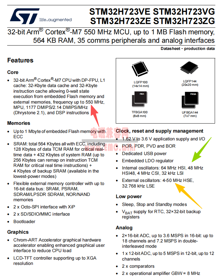 核心工作频率推导 (System Clock Logic)STM32H723 是一款高性能 MCU,其主频通过内部 PLL (锁相环) 对参考时钟进行倍频产生。 根据芯片手册 与 PCB 实拍图,该系统包含以下关键时钟源: HSE (高速外部晶振):PCB 实拍显示采用了一颗 8.000 MHz 的无源晶振。手册指出该芯片支持 4-50 MHz 的 HSE 输入。 HSI (高速内部振荡器):芯片内置 64 MHz 的高精度内部振荡器,常用于系统启动或作为 PLL 的参考源。 CSI (低功耗内部时钟):内置 4 MHz 时钟,用于低功耗运行模式。 LSE/LSI (低速时钟):分别为 32.768 kHz(外部实时时钟)和 32 kHz(内部看门狗时钟)。